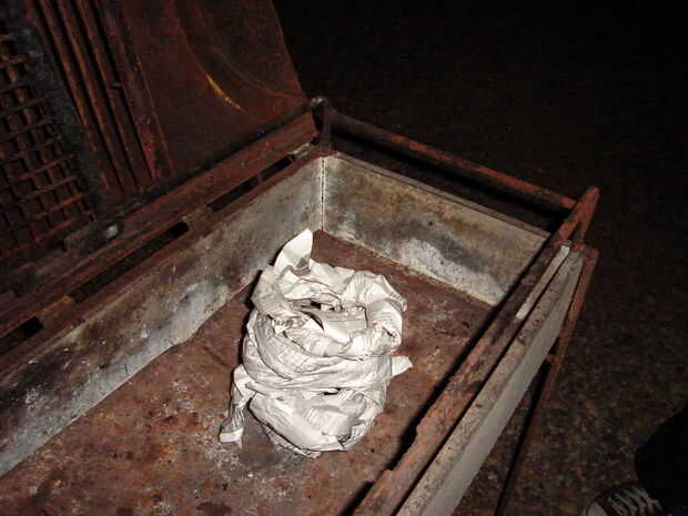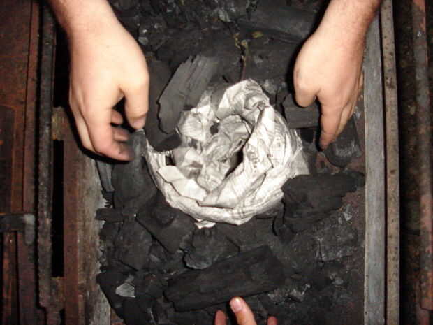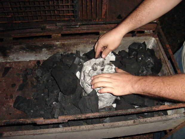 ponga los anillos de papel uno de otro, después el carbón cerca y el orden como un "Volcán". coloca los anillos de papel uno sobre otro, luego coloca el carbón alrededor y ordenalo como un "Volcán".