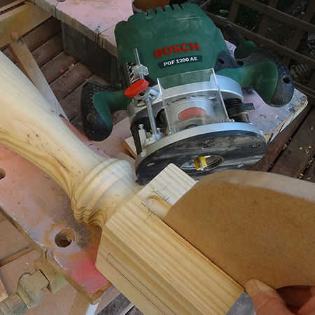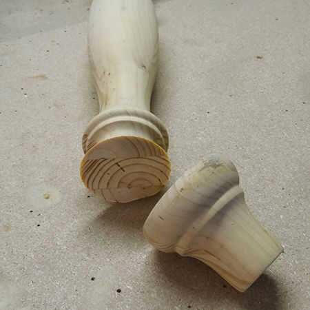 2. la parte superior para la nueva etapa se une al bloque con una longitud de 22mm pasador y pegamento de madera. Utilice una broca de 22mm para perforar hacia fuera en la pierna y el bloque superior. Agregue pegamento para madera y unen las secciones. Deje esta noche para definir. Rellenar los defectos con masilla para madera, deje seco y luego arena lisa para preparar pintura.