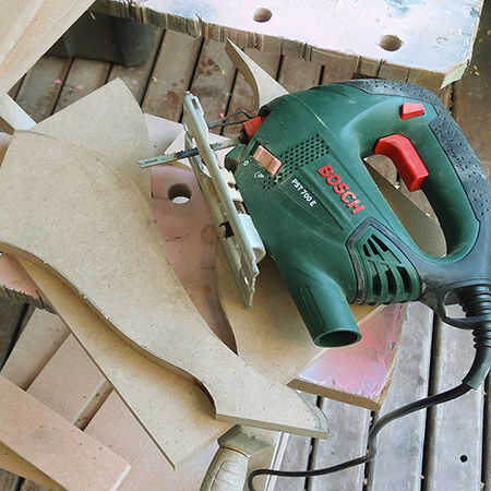 3. mientras se espera para que el pegamento se seque puede empezar a cortar los pies. Dibujar el diseño de un pie, este recorte y luego utilizarlo como plantilla para las tres patas restantes. La forma debe formar un perfecto ángulo de 90 grados hacia el lado y a lo largo de la parte inferior para que no tenga una tabla wobbly. Ampliar el diseño antes de utilizar como una plantilla.