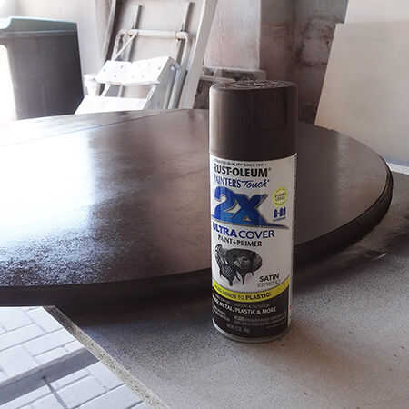 Los bordes se lija con papel de lija de grano 240 y luego la mesa entera con Rust-Oleum 2 X UltraCover en satinado espresso. Agite bien la lata y mantenga 30 cm de la superficie. Rocíe los bordes en primer lugar, como estos requiere más pintura. Trabajan de lado a lado levemente superposición de trazos para rociar la parte superior entera - permitiendo que el tiempo de secado entre cada capa de pintura. Apliqué 5 capas de pintura a la tapa de tabla, razón por la cual recomiendo dos latas de café satinado - o su elección de color.