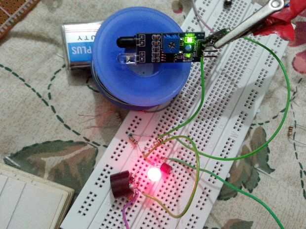 Cuando se pone la mano enfrente de módulo IR la hará el pin O/p baja a 0v y no oirás un sonido de timbre pero cuando retire la mano el zumbador comenzará sonido porque ahora módulo salida de IR pin = 5v, ahora podemos recibir 5v en la base del transistor BC547.