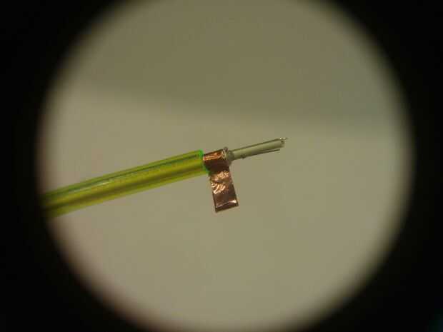 Pegue la tira de cobre lo que queda de la capa interna y rodillo con los dedos. Luego doblar los dos alambres finos en la cinta de cobre utilizando el cuchillo. Tirando de los cables en la esquina de la cinta de cobre y revestimiento exterior con el cuchillo, debe cortar el cable a la longitud perfecta.