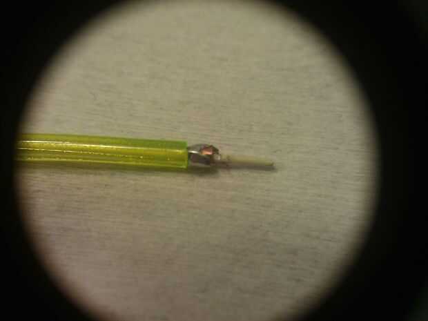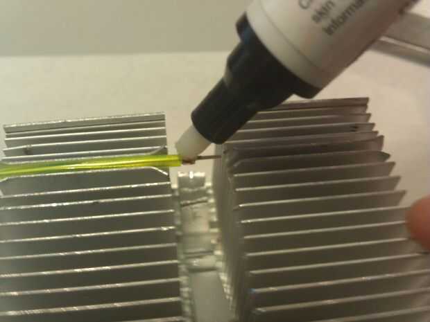Sujetar EL alambre entre dos aletas del disipador de calor (o lo utilizas como una pinza) y aplique una gota de flujo en la cinta. Soldar los cables finos a la cinta de cobre y este paso se hace!