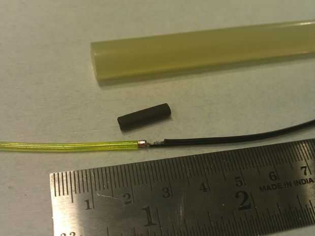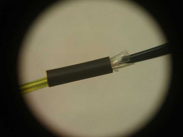 Si tienes un gluegun, puede intentar poner algun pegamento recto en la Unión y tire el termo retráctil en la parte superior. Es más fácil que las virutas de corte, pero difícil de conseguir una capa lo suficientemente delgada de pegamento así la engarzadora cabrá sobre.