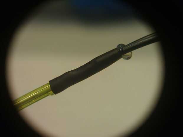 Suavemente usando una pistola de calor, calentar el termo retráctil hasta que se contrae sobre la Unión. Recuerde, la pistola de calor puede derretir el cable EL revestimiento así que suave con ella. Además, no se apresure este paso, desea que el pegamento se derrita antes de que se contrae la engarzadora! Si esto ha funcionado bien, deberían ver algunos cola Haz exprimido fuera de los extremos. Antes totalmente, ordenado esto para arriba.