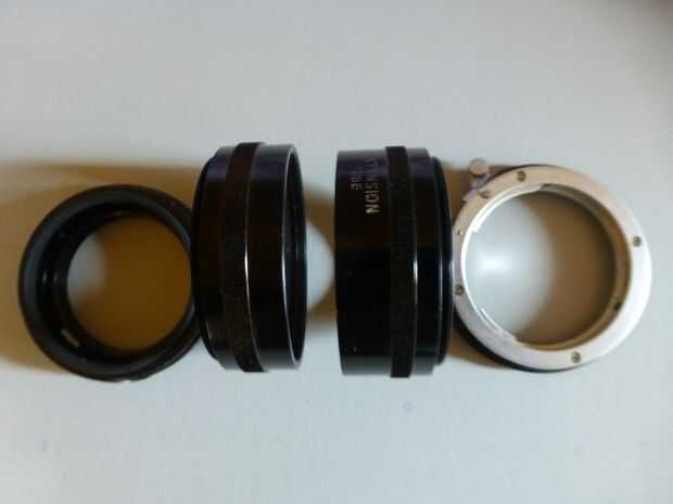 Los tubos de extensión se realizan en grupos de tres o cuatro guarniciones del tornillo, que pueden ser utilizados individualmente o en combinación. Mi cuerpo de la cámara tiene una montura de bayoneta, así que necesito un adaptador inverso para instalarse entre el cuerpo de la cámara y los tubos de extensión y otro adaptador entre la lente y los tubos de extensión.