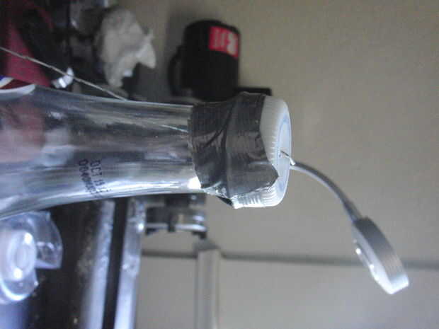 Esto es sólo una manera de hacer esto sin un torno, hay mucha maneras más fácil/más seguro pero esto debería darte una idea. Usted necesita algo que se ajuste sobre la parte superior o inferior de la botella que puede fijar cuerda a. Usted podría siempre cadena de cinta de conducto directamente a tú botella pero esto es más repetible. Me pareció que una tapa de botella de agua un buen ajuste así que perforó un agujero en la parte inferior y había atado alguna cadena delgada a un trozo de madera y había grabado dentro de la tapa. Luego grabó la tapa a la botella y ató la cadena a mi techo. Entonces yo simplemente girar la botella hasta la acumulación de rotación en la cadena, regula la velocidad por grabar con mi dedo. Asegúrese de que tiene algo directamente debajo de la botella para que no caiga demasiado y romper.