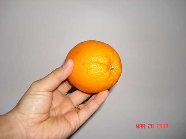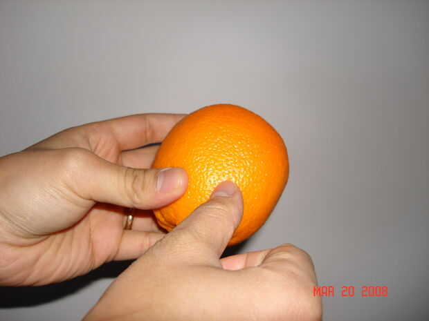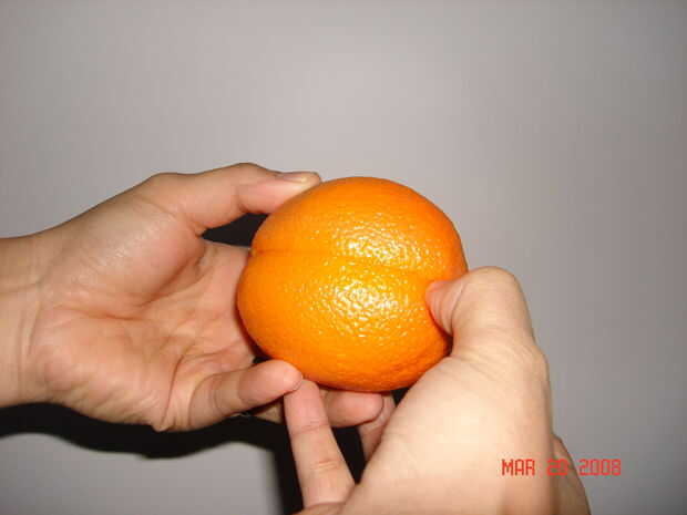 Primero encontrar un lugar en el orange donde crees que el segmento bajo la cáscara podría ser. Luego realizar un crack usando su dedo pulgar (o cuchillo) de extremidad inferior en superior.