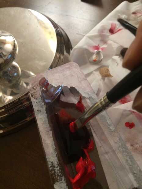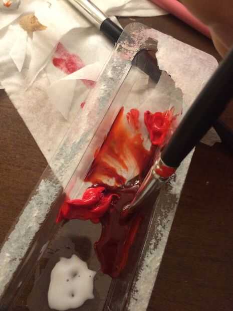 Utilizo la sangre falsa barata encontrará más tiendas de un dólar en época de Halloween. Mezclar el maquillaje crema rojo con la sangre se espese un poco y añadir grupos a la sangre como coágulos. Aplicar que cómo quiere que se vea.