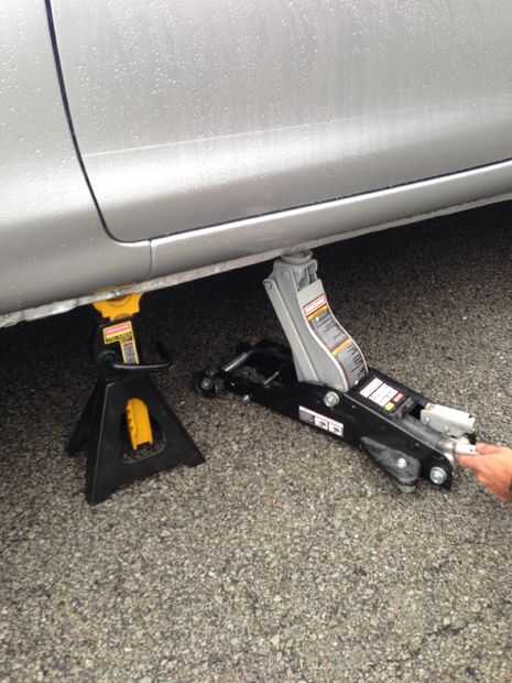 Aparcar el coche al nivel del suelo y coloque el gato debajo del coche. Antes de arrancar el coche, aflojar los pernos de la llanta. (LA RUEDA DELANTERA IZQUIERDA)