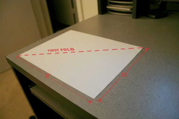 Empezar con un tamaño de letra estándar (8 1/2 "x 11" hoja de papel. Doblar diagonalmente a través del borde largo.