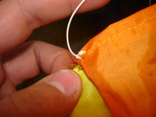 Ahora necesitas algún método de asociar a algo, en lugar de abordar con alambre usé un montón de cadenas para mantener su forma. Necesita cortar 4 6" piezas de nudos cadena y lazo en cada extremo. Usted también necesitará una 8" pieza con nudos. En el frente de la manga cortada entre si 4 agujeros opposie (Imagine una cruz sobre la abertura, ponerlas donde la Cruz toca la tela) luego atarlos junto con la cadena de 8". Debe parecerse a continuación.
