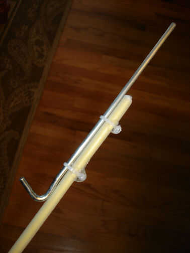 Primera línea hasta la estaca de la tienda en un lado del poste y zip empate en, pero suelta bastante que usted puede todavía deslícelo hacia arriba y hacia abajo. Pegamento caliente en el lugar. Ahora poner una amarra en el otro lado y atar la manga de viento a él. También caliente pegue esto en su lugar y no olvide cortar el exceso. Ahora tienes un calcetín del viento colapsable portátil. Embalarlo hasta envolver alrededor del poste y Remétala bajo sí mismo.
