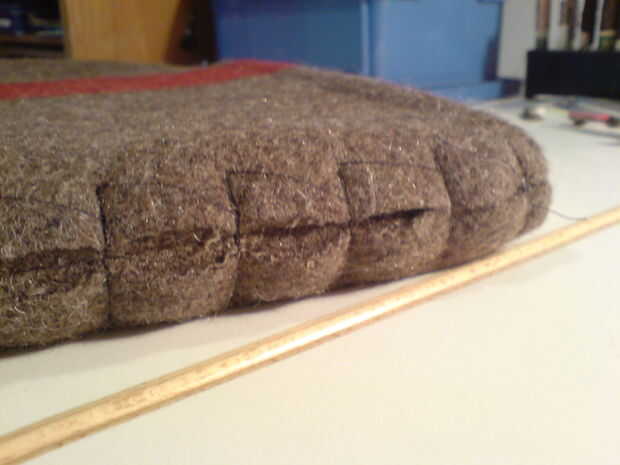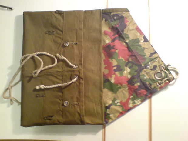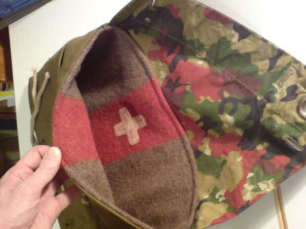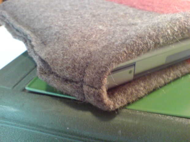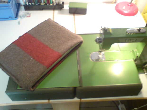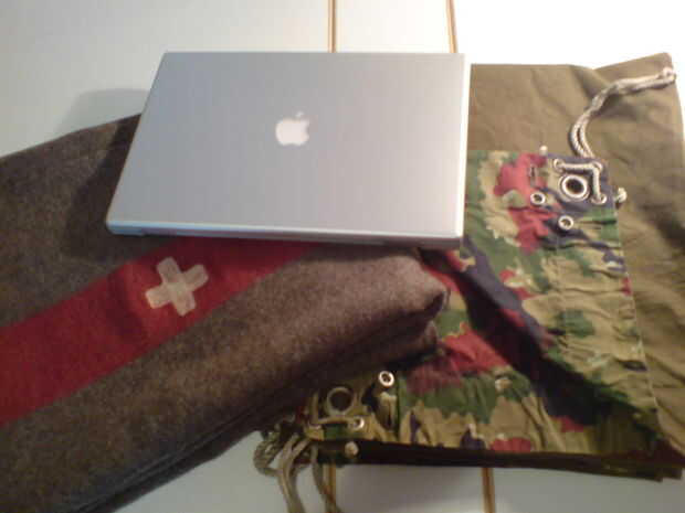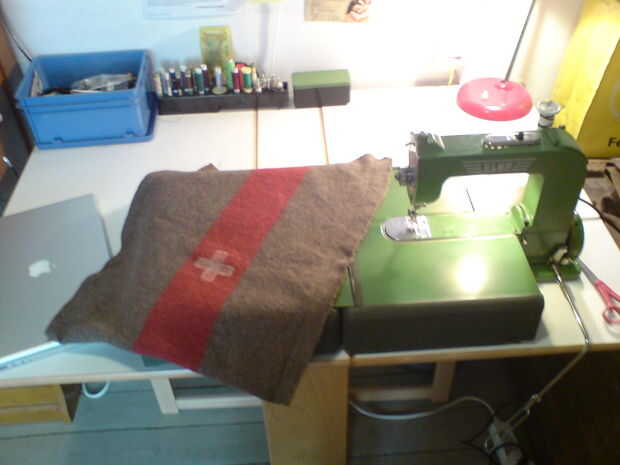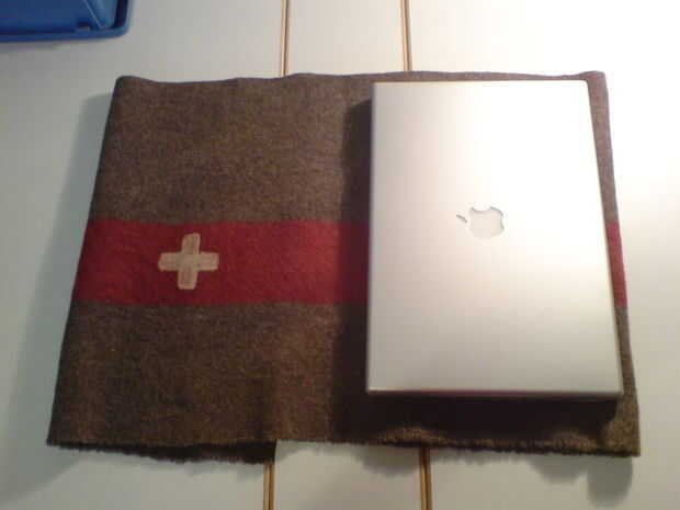me gusta reutilizar materiales viejos y ponerlos en un nuevo contexto Asi que me hice una funda personalizada para mi MacBook Pro en una manta de lana afieltrada y una lona de la tienda. Ambos materiales que compré en una tienda militar de Suiza durante mi último viaje a mi país de origen.