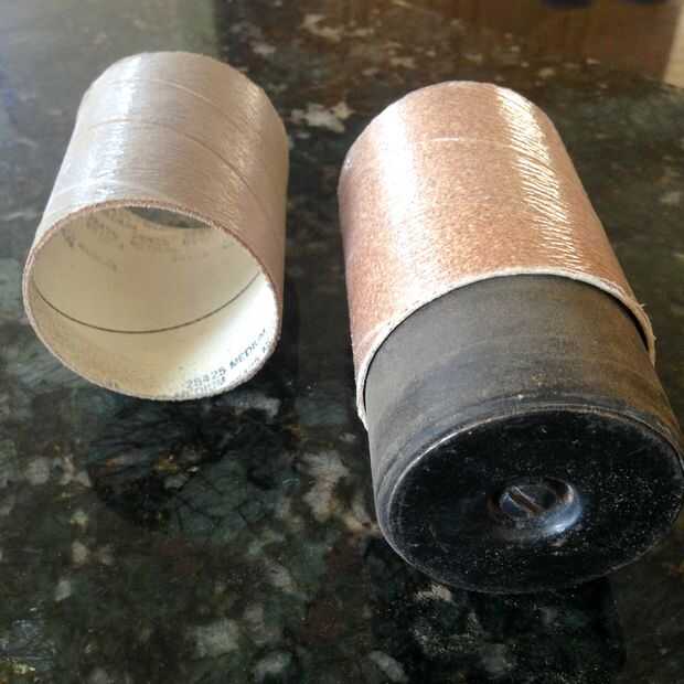 El lado izquierdo de la foto muestra una manga de artesano que tengo. La derecha de la foto muestra el tambor de lijar que artesano dentro de una manga Shopsmith. Mangas de artesano se deslice hacia el tambor con algo de dificultad. El ajuste es muy apretado. Las mangas Shopsmith están sueltas, incluso después de apretar el tornillo de la batería tanto como sea posible.