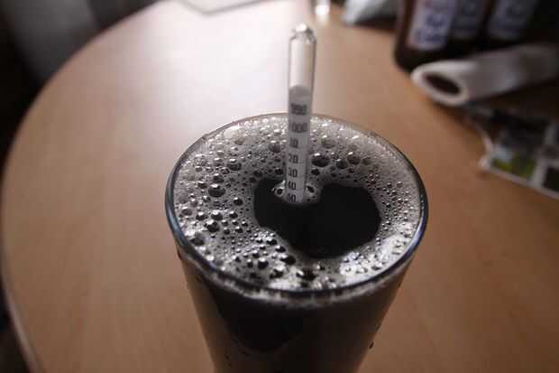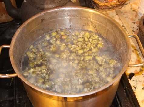 La cerveza se calienta a punto de ebullición, los saltos arrojados y hierve vigorosamente, permitiendo que el vapor se escape hasta que se logra la deseada SG. Para mí, esto fue en 1050. MBM la SG debe ser medido cuando la infusión esté a temperatura ambiente para obtener un valor exacto.