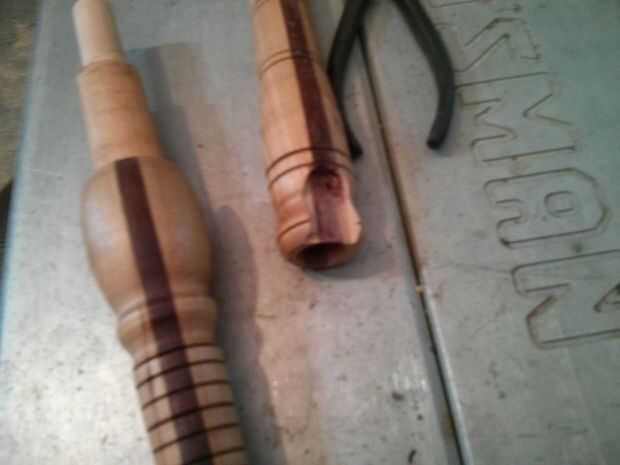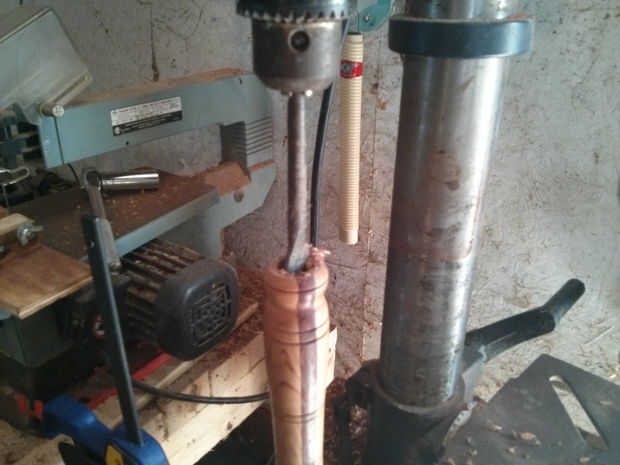 Su empuñadura trasera verticalmente en el taladro e instale un 5/8" broca en el portabrocas. Ahora perfore a una profundidad de 1.25" en el extremo. Es muy importante que el mango es recto y agradable. Esta parte será que la más notable si le sucede que malinterpreten su ángulo así medir una docena de veces antes de perforar.