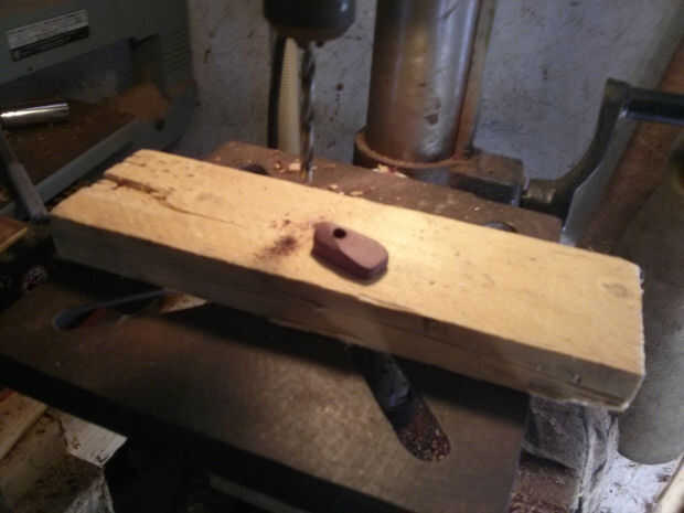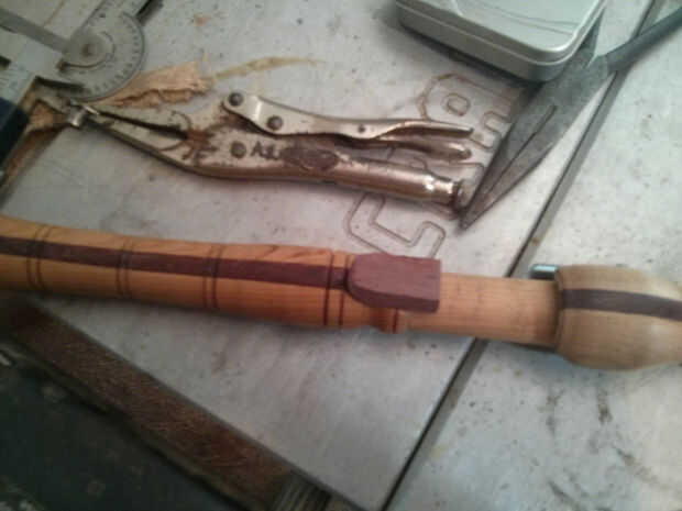 Corte la cerradura de carrete de una 5 "x 1" pieza de purpleheart de desecho, a una longitud de 1" y utiliza la lijadora de banda para darle forma a mano. La parte superior del pie de carrete es convexa en forma, usé una dremel con un tambor de lijar a cóncavo ligeramente la parte inferior de la misma instalación regularmente. Yo entonces comenzó un borde para ajustar la muesca que creé en el mango, otra vez comprobar regularmente. Por último, lo terminé para arriba con un lijado y pulimento.