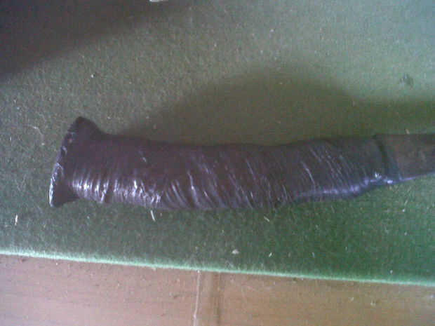 El mango del hacha tiene 5 bolsas envueltos alrededor de él.