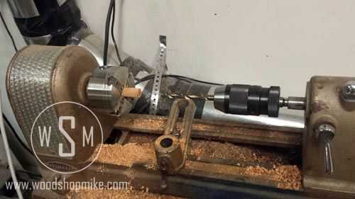 Aquí estoy haciendo un buje para mi gubia de eje de 3/8 detalle. Me he convertido el OD de un pedazo de cerezo para que va a ser una presión en la tubería. Yo ahora estoy perforando hacia fuera el casquillo para aceptar la espiga de la gubia. Que perforar esta un poco demasiado pequeño para tener un buen ajuste.