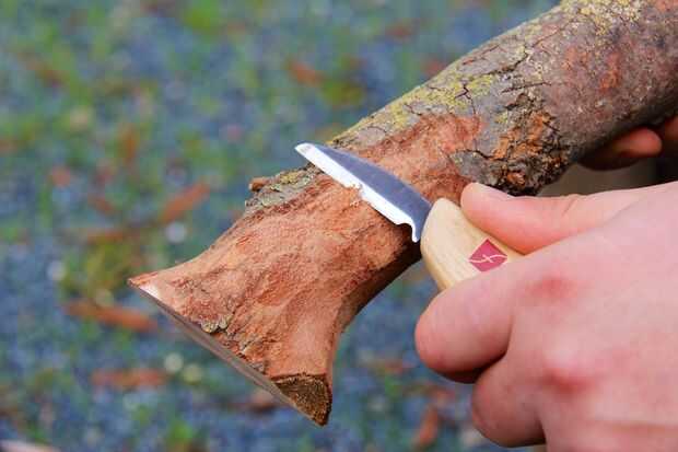 Usando uno de los más grandes cuchillos whitling, quitar toda la corteza en la pieza de madera. Recuerde, siempre tallar lejos de su cuerpo y use pequeños movimientos controlados para quitar material.