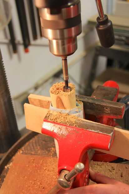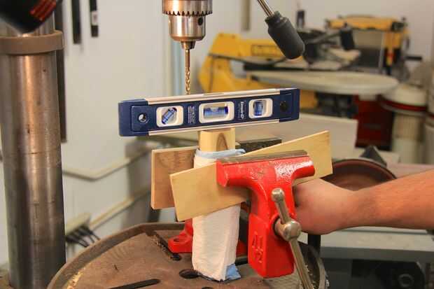 Nos quería asegurarse de que estaba perforación cerca de perpendicular como sea posible en el mango. Puesto que el mango es un poco de un objeto en forma orgánico revisé mis ojos con un nivel de Plaza hasta el pedacito de taladro. Es bastante fácil de ver cuando estás en el estadio de béisbol de Plaza mediante este método.