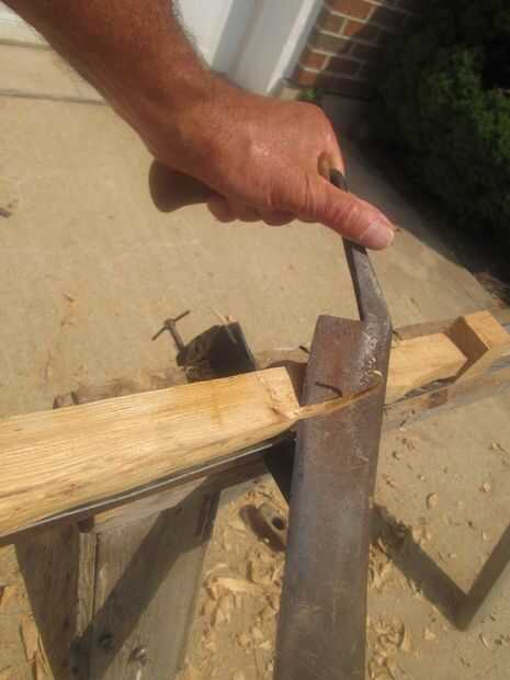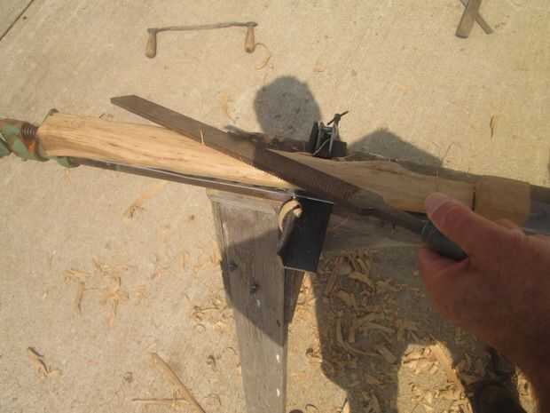 Empezar a redondeo de las esquinas de la manija del cuchillo del sorteo. Tuerca de corte demasiado profundamente o demasiado agresivo. Cuando lo consigo cerca de forma final, utilizar una escofina de madera grande para darle un contorno final. Luego ir con una escofina fina para llegar a su forma final.