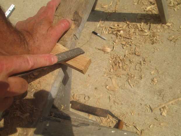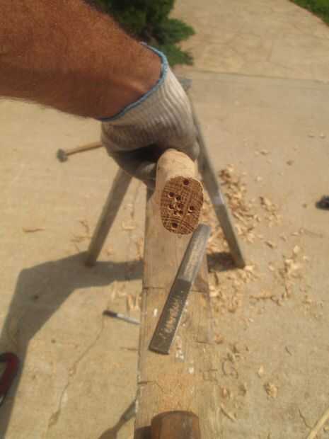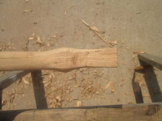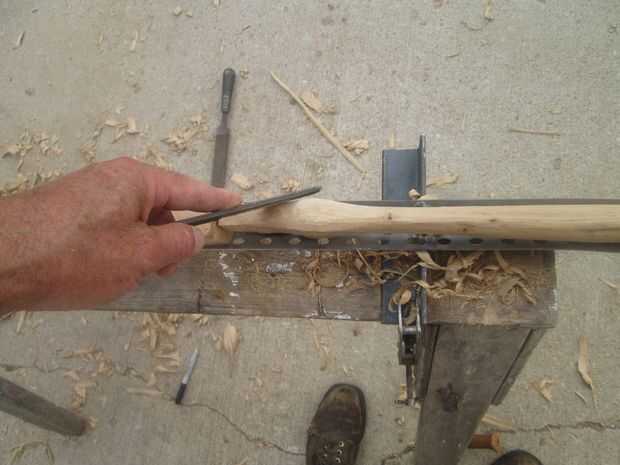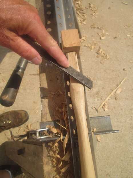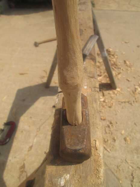 Utilice una escofi na pequeña para formar la parte de soporte de herramienta de la manija. Alrededor del hombro donde la cabeza del martillo se parada y llegar a una forma agradable. Comienzan entonces el poste de soporte de la herramienta de redondeo. Todo las esquinas y la trabajo que abajo eran sólo empieza a caber en la cabeza del martillo. Ahora está listo para encajar el mango a la herramienta.