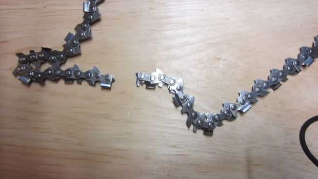 Lo primero que hice fue cortar la cadena con la amoladora y un disco de corte. La amoladora hizo un trabajo rápido de la hoja. Simplemente fija la cadena a un tablero y vino en desde arriba entre los links. Si no tienes un molinillo, estoy seguro que esto también podría lograrse con una sierra para metales.
