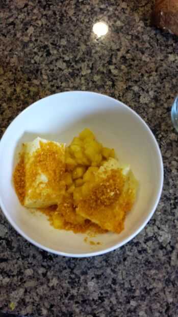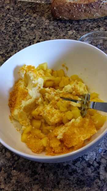 2. en una bol mezcla una losa de la mantequilla a temperatura ambiente, polvo de mango, había picado fresco Mango y Agave mezclado con miel.