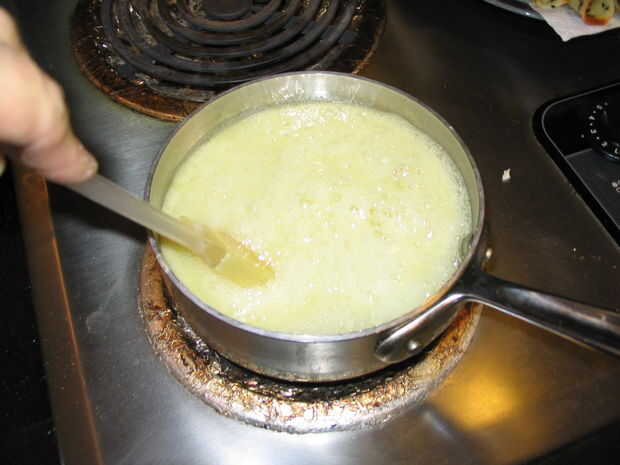 Para cada una parte de jugo de jengibre, añadir en algún lugar entre 3 a 4 partes de azúcar. Reducir a fuego bajo solo a fuego lento. Tenga cuidado de no quemarla o hervir. Una vez que esté todo el azúcar en la solución permita que se enfríe.