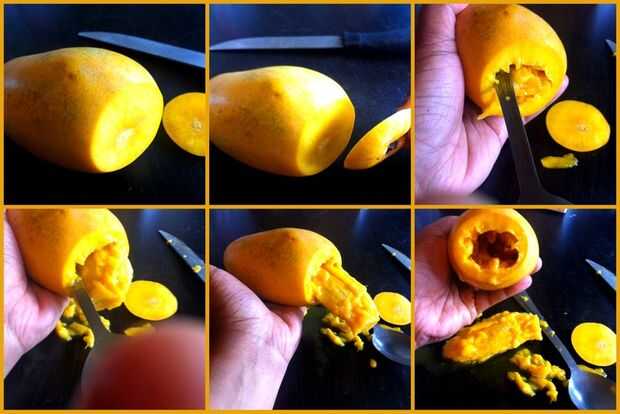 5. El mango es hueco para poder verter la mezcla de jugo de mango en su interior.