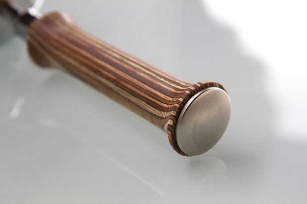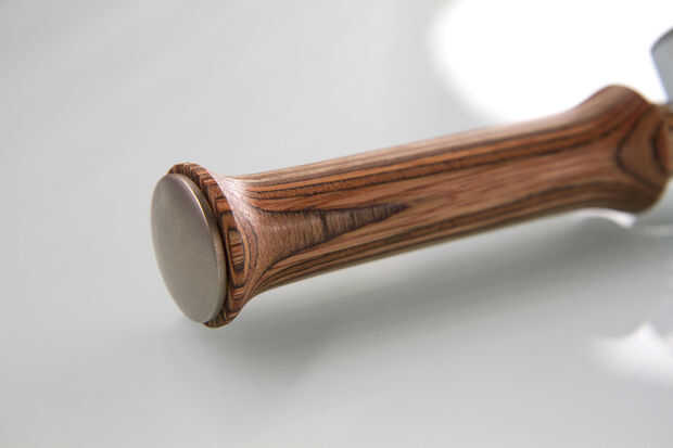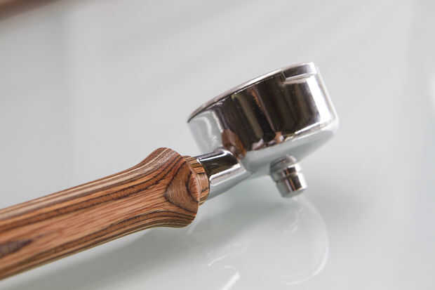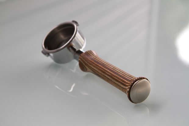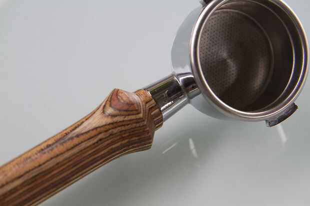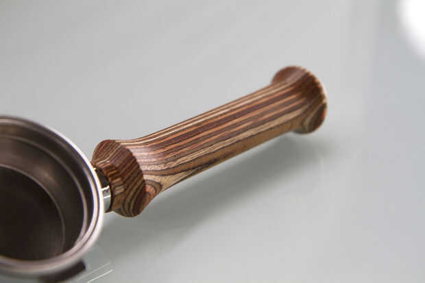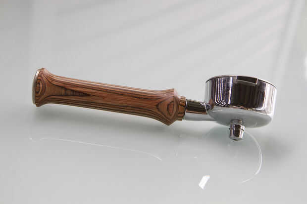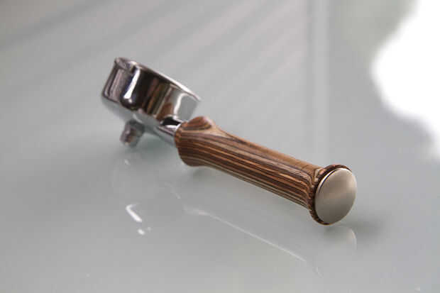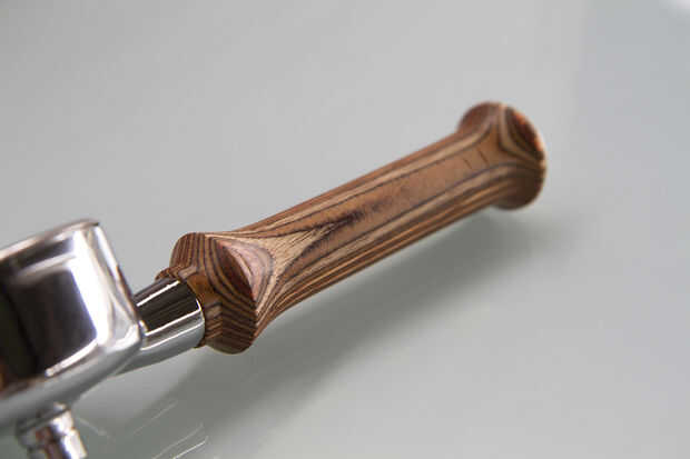 recientemente hemos reemplazado el mango de plástico negro stock en nuestra máquina de café espresso con una mano tallada de madera.  Tallada con un cuchillo whittling y luego en forma más con poder manejar herramientas, esta madera son bastante rect