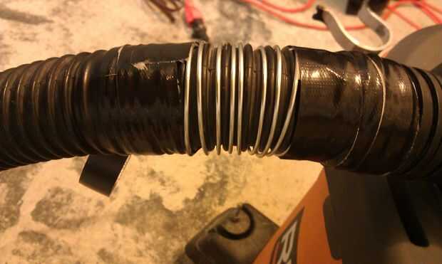 Usted debe notar que la manguera es acanalado (con textura con anillos concéntricos). Tratar de torcer la manguera en la hélice del alambre como un tornillo. Alambre en cada otro anillo de la manguera es probablemente suficiente.