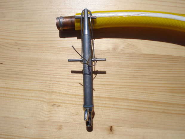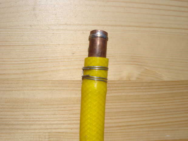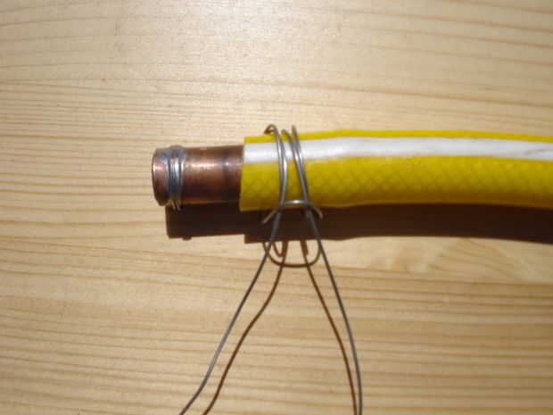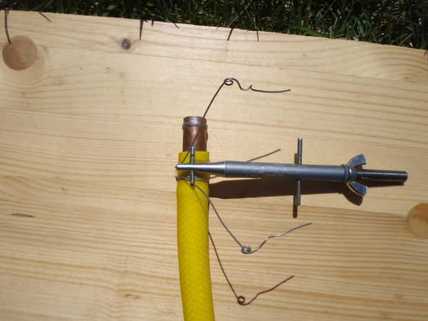 Tome el cable (4 vueltas alrededor de la manguera y 12 pulgadas de longitud), doblar por la mitad y enrolle la manguera con, poner los dos extremos por el lazo donde se dobla sobre la abrazadera tiene 4 vueltas de alambre alrededor de la manguera.