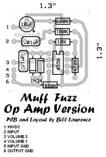 Escolhi o efeito Muff Fuzz com um diseño bem pequeno. Você pode encontrar todo o esquemático no fuzzcentral sitio.