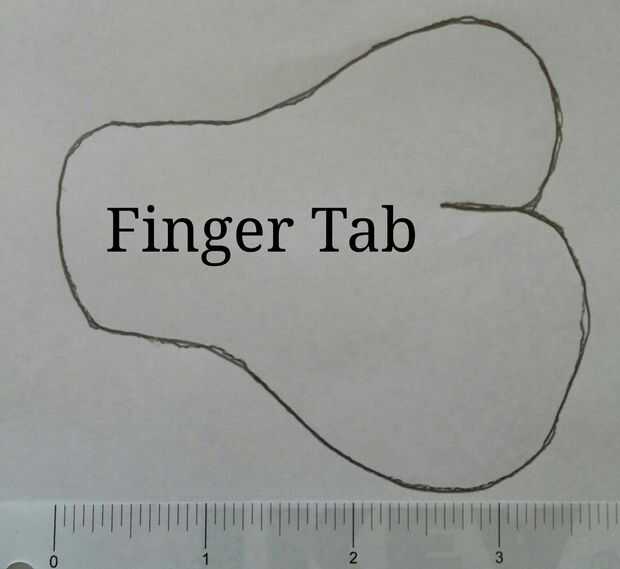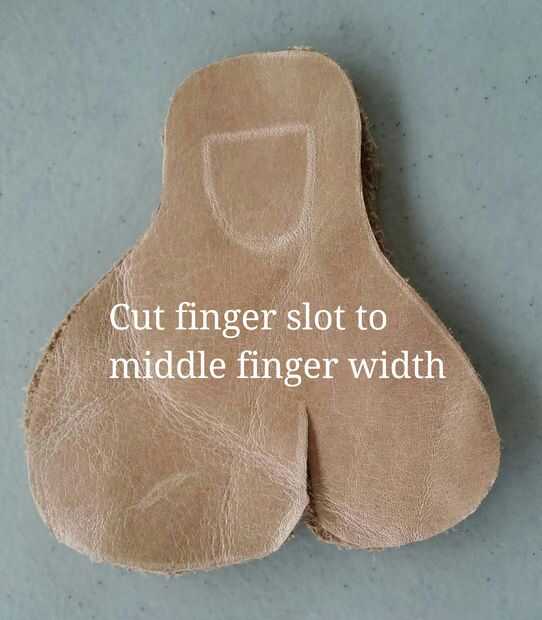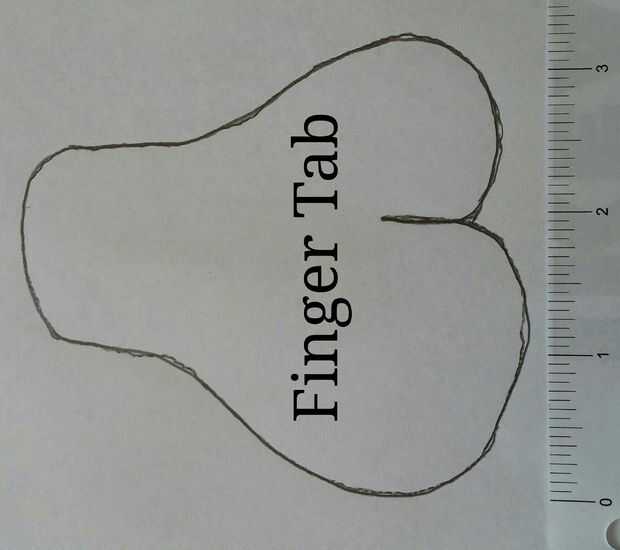 1 - cortar un lado de la pestaña de dedo, seguir la plantilla anterior (imágenes 1 y 2, tamaño = 3,5 pulgadas largo x 3,4 pulgadas de ancho). El tamaño puede variar según el tamaño de su mano. La idea es utilizar tres dedos (puntero, media y los dedos anulares) Tire de la cuerda del arco.