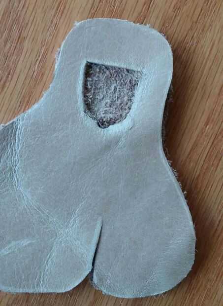 3.-a continuación necesita cortar el orificio del dedo medio. El tamaño del orificio está basado en ancho de dedo medio. Hacer el corte con unas tijeras o un cuchillo x-acto en una sola pieza primero, luego siga con el otro.