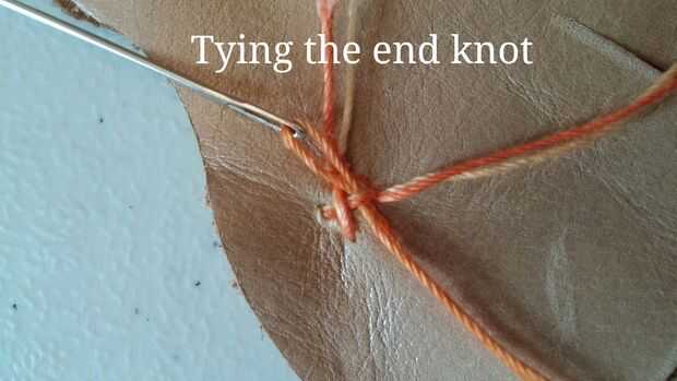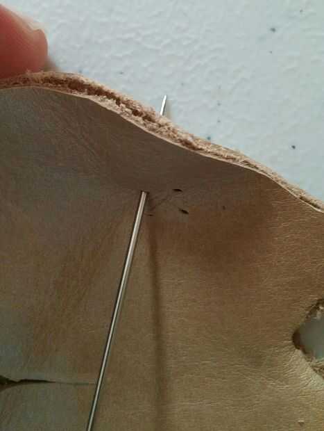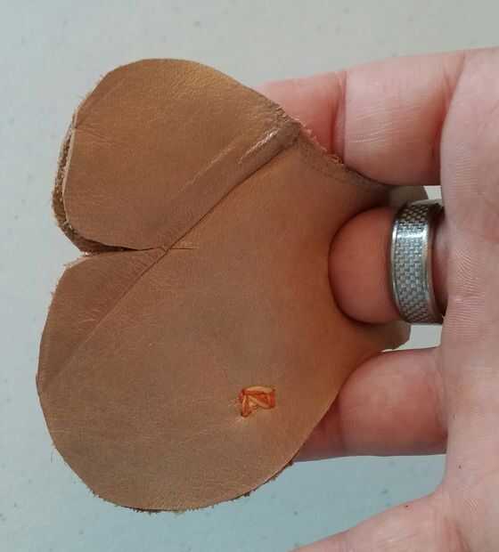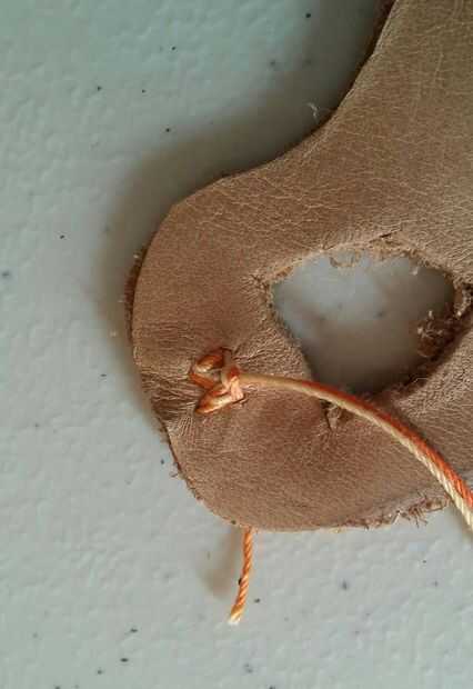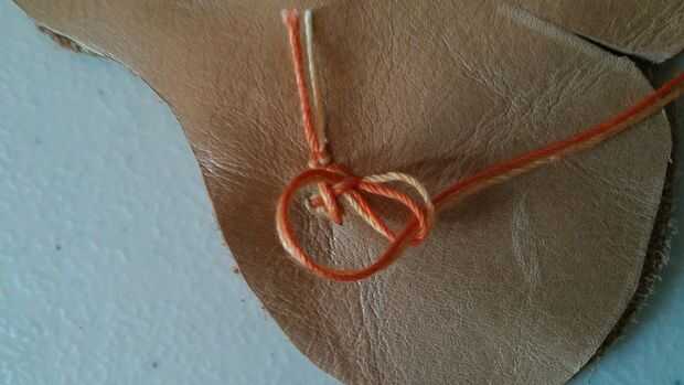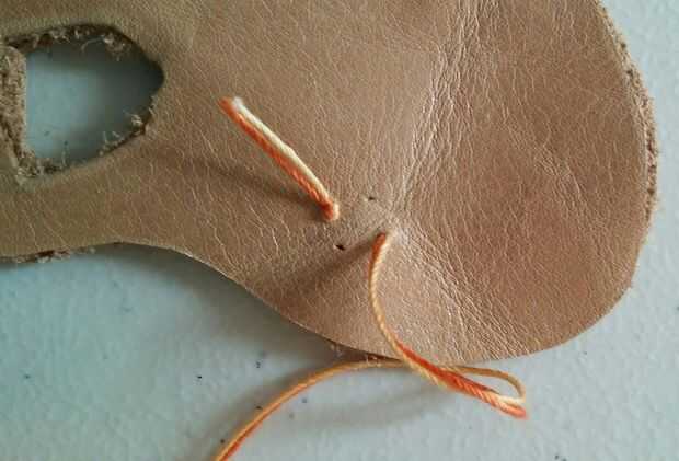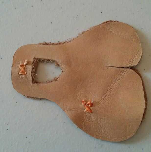 2 - lugar el cuero piezas juntos (lados más suave de la piel uno frente al otro). El patrón/método para coser no importa, sólo tiene que fijar las dos piezas de cuero en esos lugares. Haga un nudo para terminar la costura de cada sección.