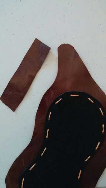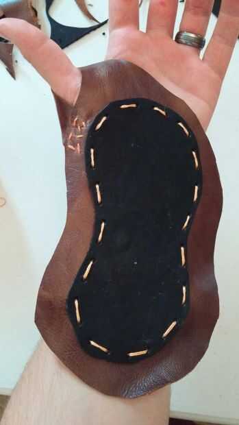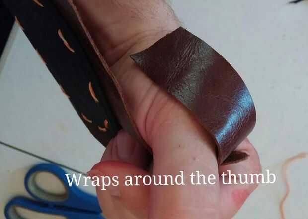 3 - medida cuánto cuero es necesario envolver el dedo pulgar y donde tendrá que coser para el manguito. Entonces hacer una puntada similar que el anterior.