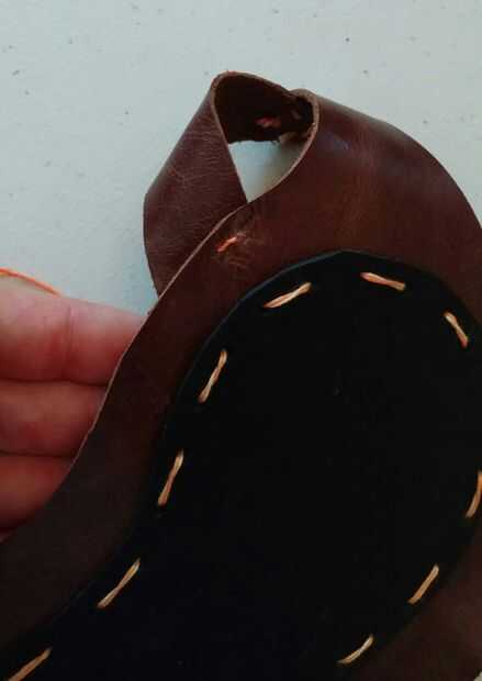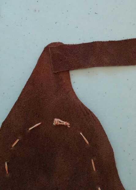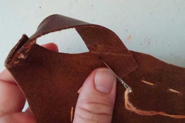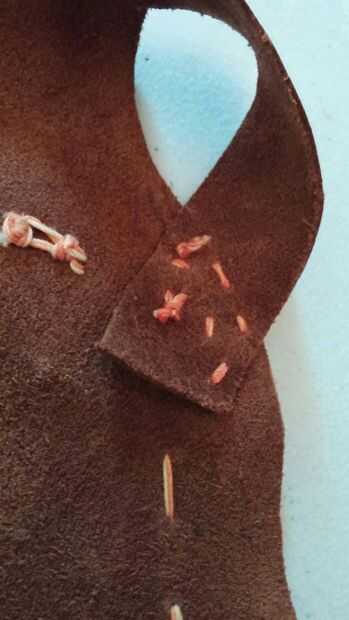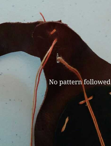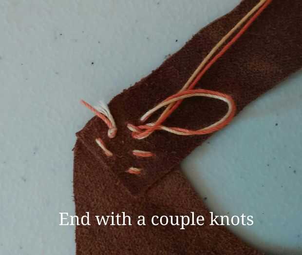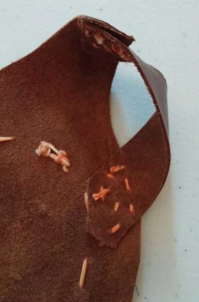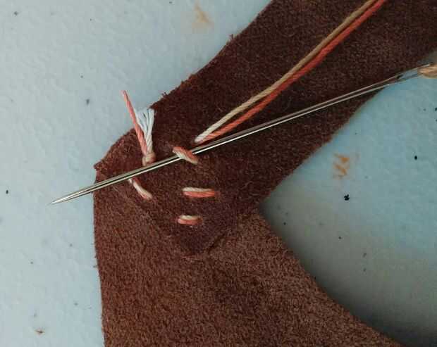 2 - coser la parte superior primero. Hacer un nudo en el extremo de la cuerda y luego empezar a coser, a partir de debajo de la piel. El patrón de costura no importa, lo importante es que tiene suficientes conexiones (arriba/abajo) para que sea un vínculo sólido. Terminar la costura con un nudo o 2 o 3.