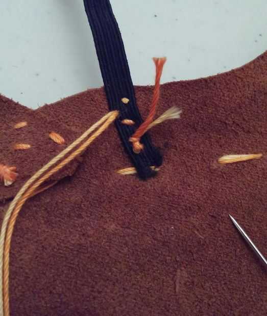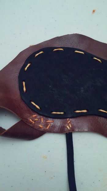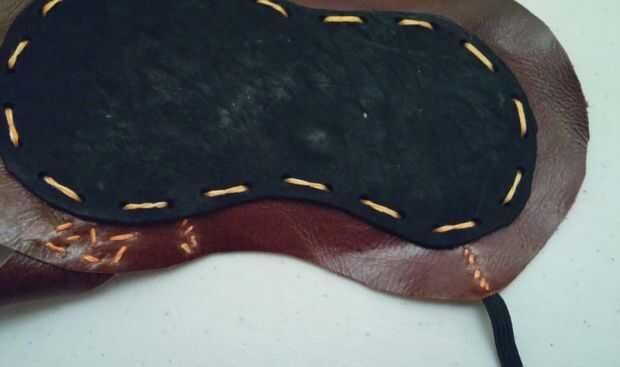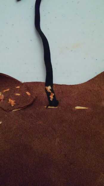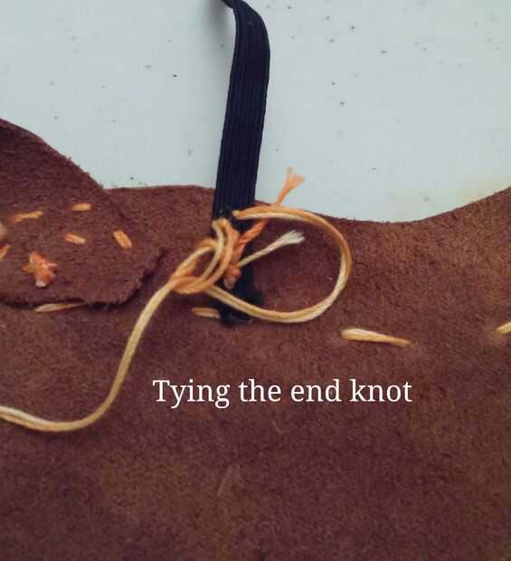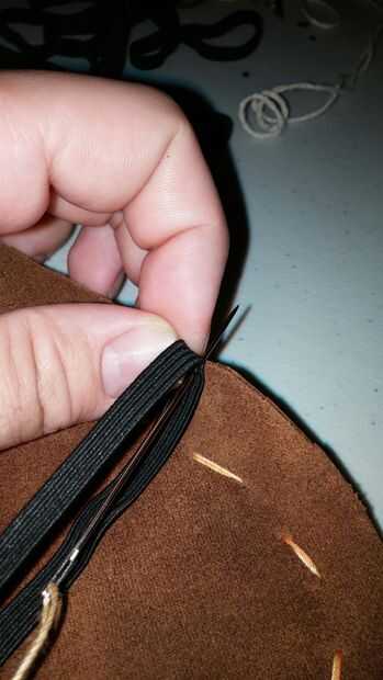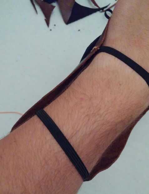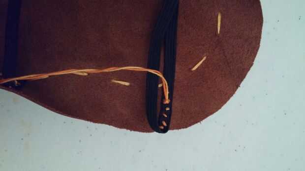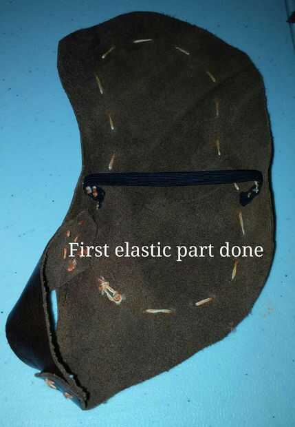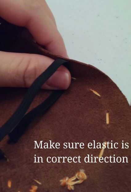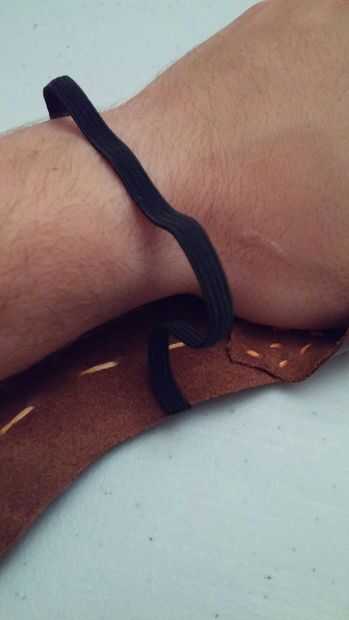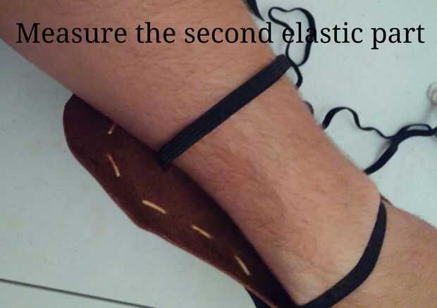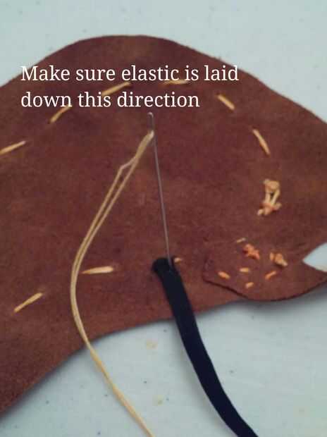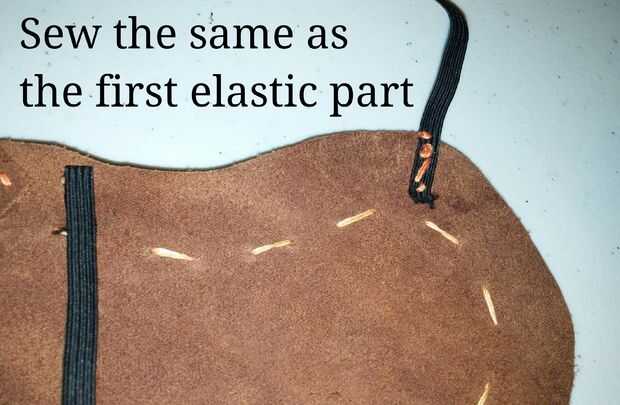 2 - ahora Colóquese el manguito y medir el elástico encuentro el manguito en el otro lado. Asegúrese de que el elástico quede ajustado/apretado, esto ayudará a mantener el manguito en su lugar cuando disparas. Realizar otra vez la puntada mismo/similar usado antes pero teniendo en cuenta la dirección elástico, cola en el interior del manguito (ver fotos arriba).