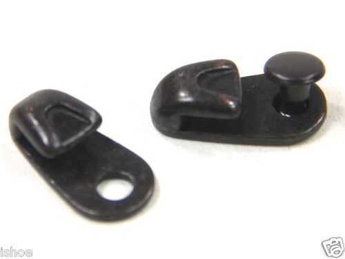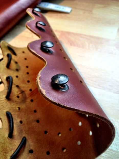 La parte difícil será encontrar unos ganchos de encaje. Tal vez eres mejor tiro será a una tienda de reparación de calzado local. Estos ojales se utilizan en senderismo botas y botas militares para la parte más superior de la lazada. O busque en ebay por "ganchos de encaje". Hay muchos diversos estilos disponibles. Dependiendo del diseño de gancho tienes que colocar los agujeros para los remaches de los ganchos de un poco más al centro del manguito.