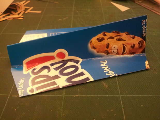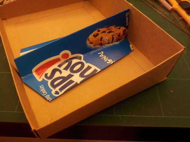 Como los gemelos se hacen de metales, el panel, que es sólo un pedazo de cartón, es demasiado débil para soportar 35 pares de gemelos. Un centro de apoyo se agrega entre el panel y la parte inferior de la caja. Acabo de agarrar una caja de galletas y cortar una parte para formar el apoyo.