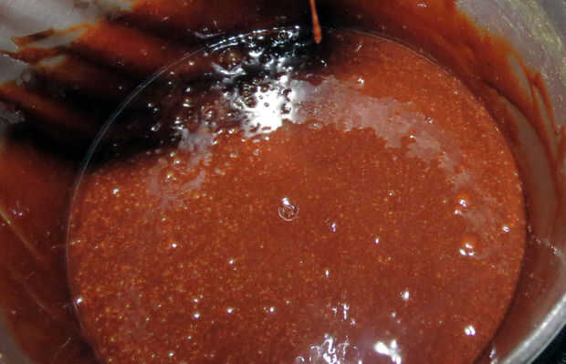 Derrita la mantequilla en una cacerola mediana sobre fuego medio. Retirar del fuego, añadir azúcar y el cacao en polvo y batir hasta combinar bien. Mientras batir vigorosamente, verter lentamente en huevo batido.