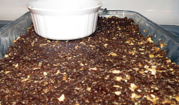 Presione la mezcla en una fuente para horno con mantequilla de 8 por 8 o 9 por 9 pulgadas. ** Me gusta usar un plato de fondo plano para ayudar a apretar uniformemente la capa inferior.