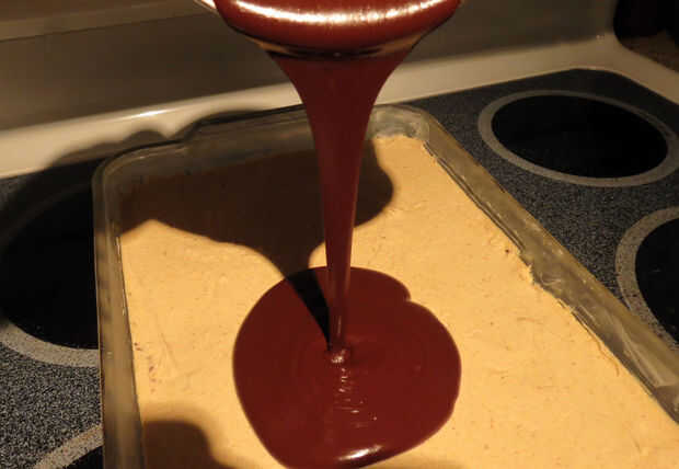 Vierta la mezcla de chocolate sobre la parte superior de las barras y se extendió rápidamente para crear una capa uniforme. ** Si trabajas lo suficientemente rápido, puede verter el chocolate y agite el plato y toque en el mostrador para conseguir un liso bonito, incluso capa de chocolate.