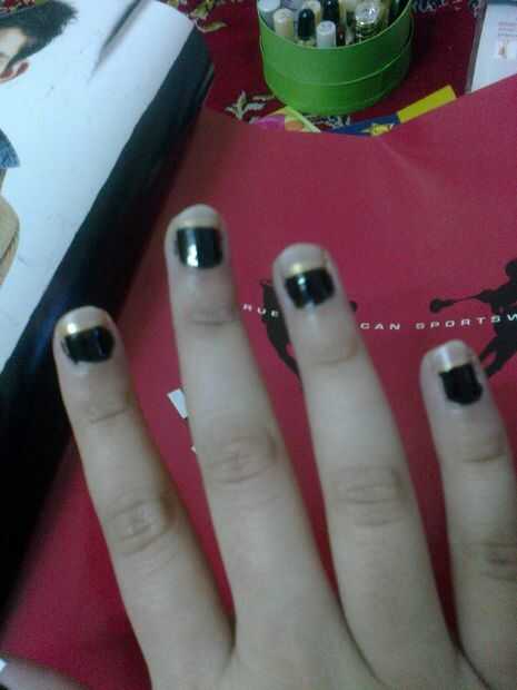 cuando se haya secado el esmalte de uñas dorado... aplicar la cinta adhesiva en esmalte oro para cubrirla y aplicar esmalte de uñas negro.