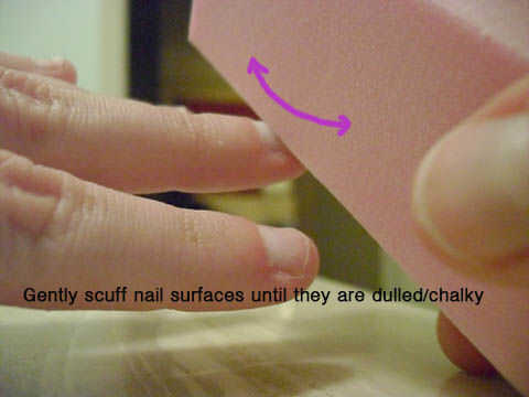 3) utilizar un búfer de uñas de grano fino para lije suavemente la superficie de las uñas. Desea que las superficies a ser un poco aburrido y calcáreo, como esto ayuda a la adherencia de los geles a la superficie de la uña. Utilice el bloque pulidor de esponja-como flexible para rayar la curva completa de las uñas y ponerse en las esquinas.
