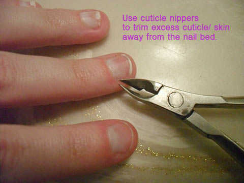 2) uso pinzas de la cutícula a recorte el exceso y secar la piel de alrededor de la cama del clavo. Esto maximizará su área para pintar. Sólo nip muerta, seco / exceso piel ausente! No trate de esculpir lejos en partes de la cama del clavo, ya que esto causará sangrado.